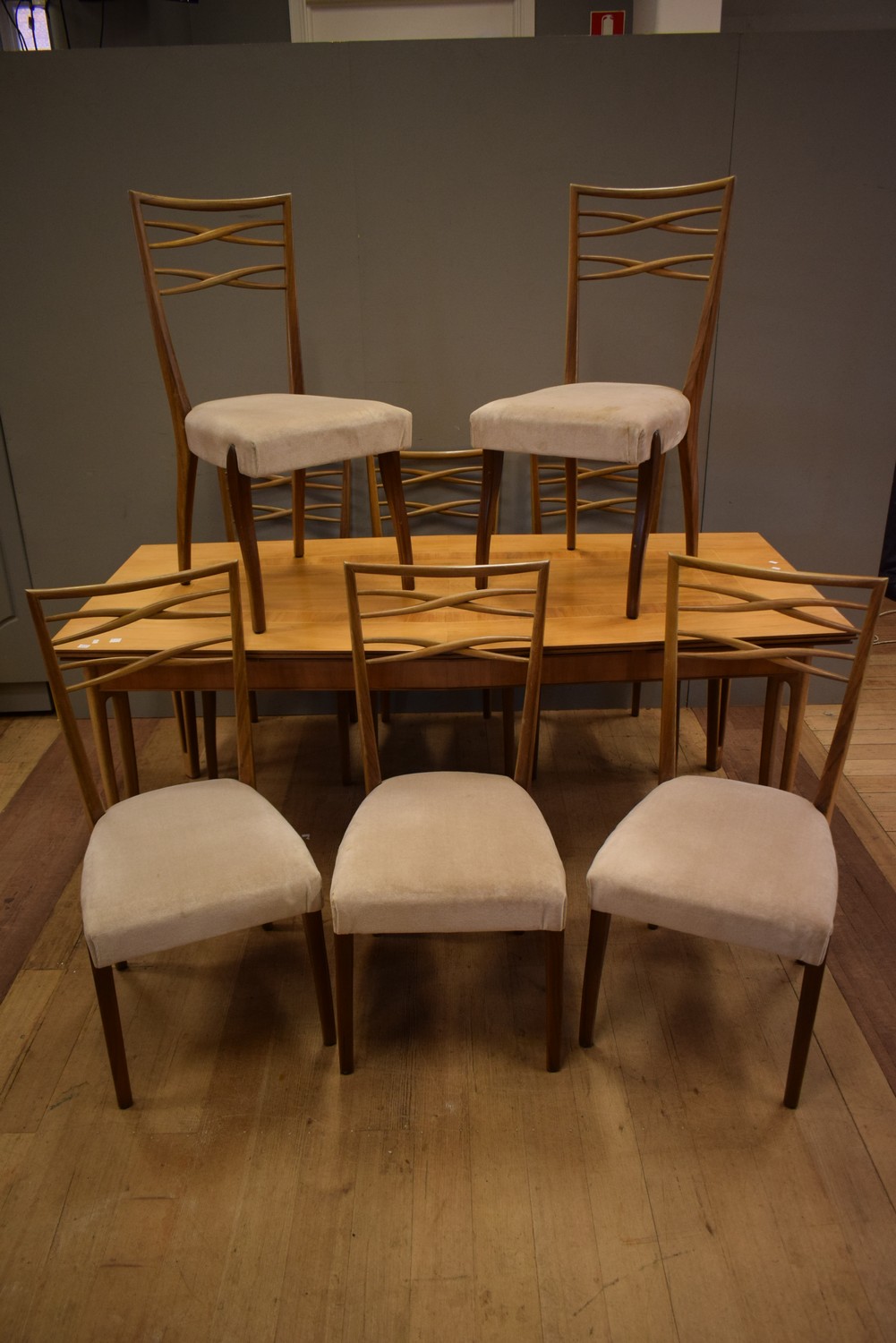 A 1960S JACOB RUDOWSKI EXTENSION TABLE WITH EIGHT CHAIRS (75H X 186W X 94D)