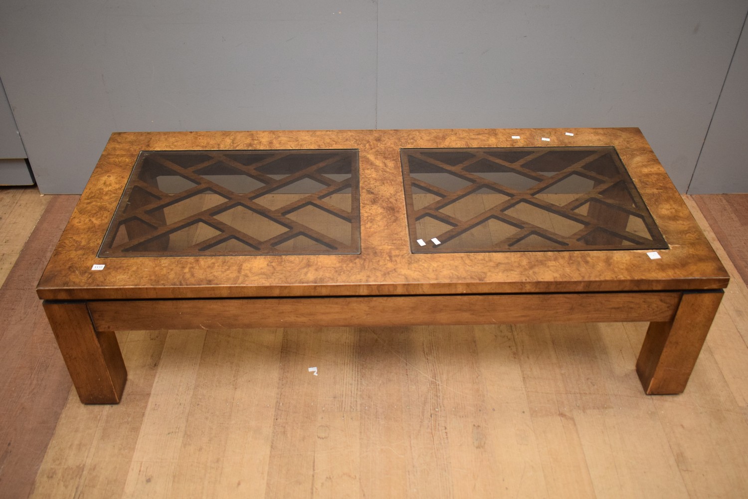 A CONTEMPORARY COFFEE TABLE WITH GLASS INSETS (40H X 152W X 65D CM)