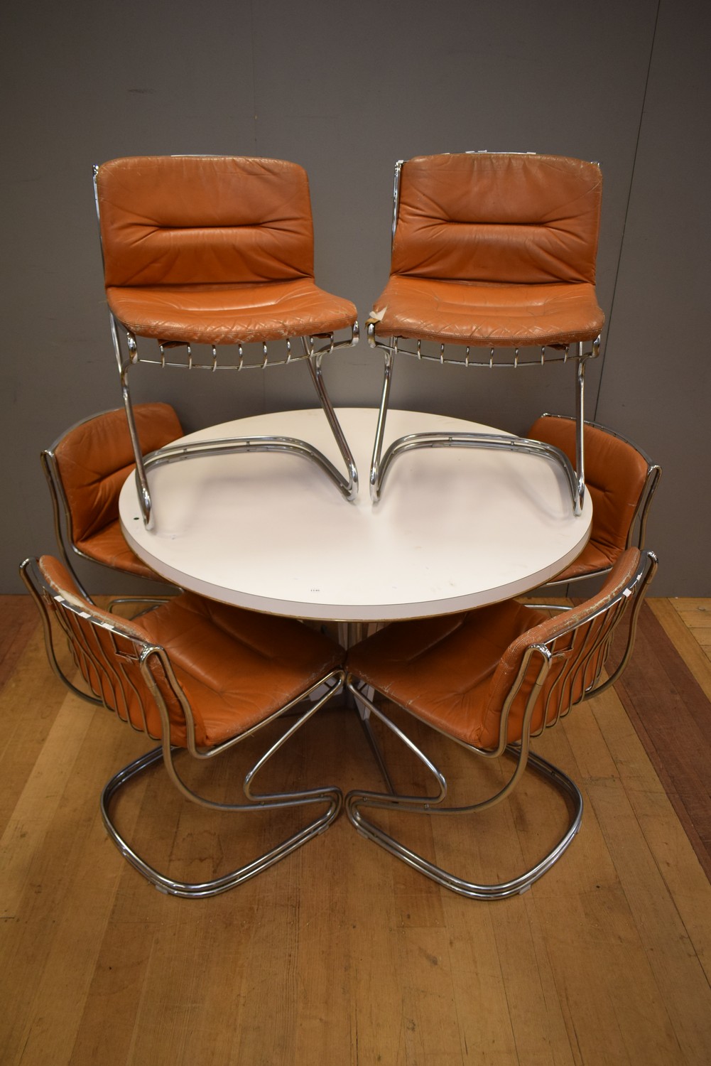 A 1970S CIRCULAR LAMINATE TABLE WITH SIX CHROME AND VINYL CHAIRS (a/f to table and chairs) (TABLE 75H X 121D)