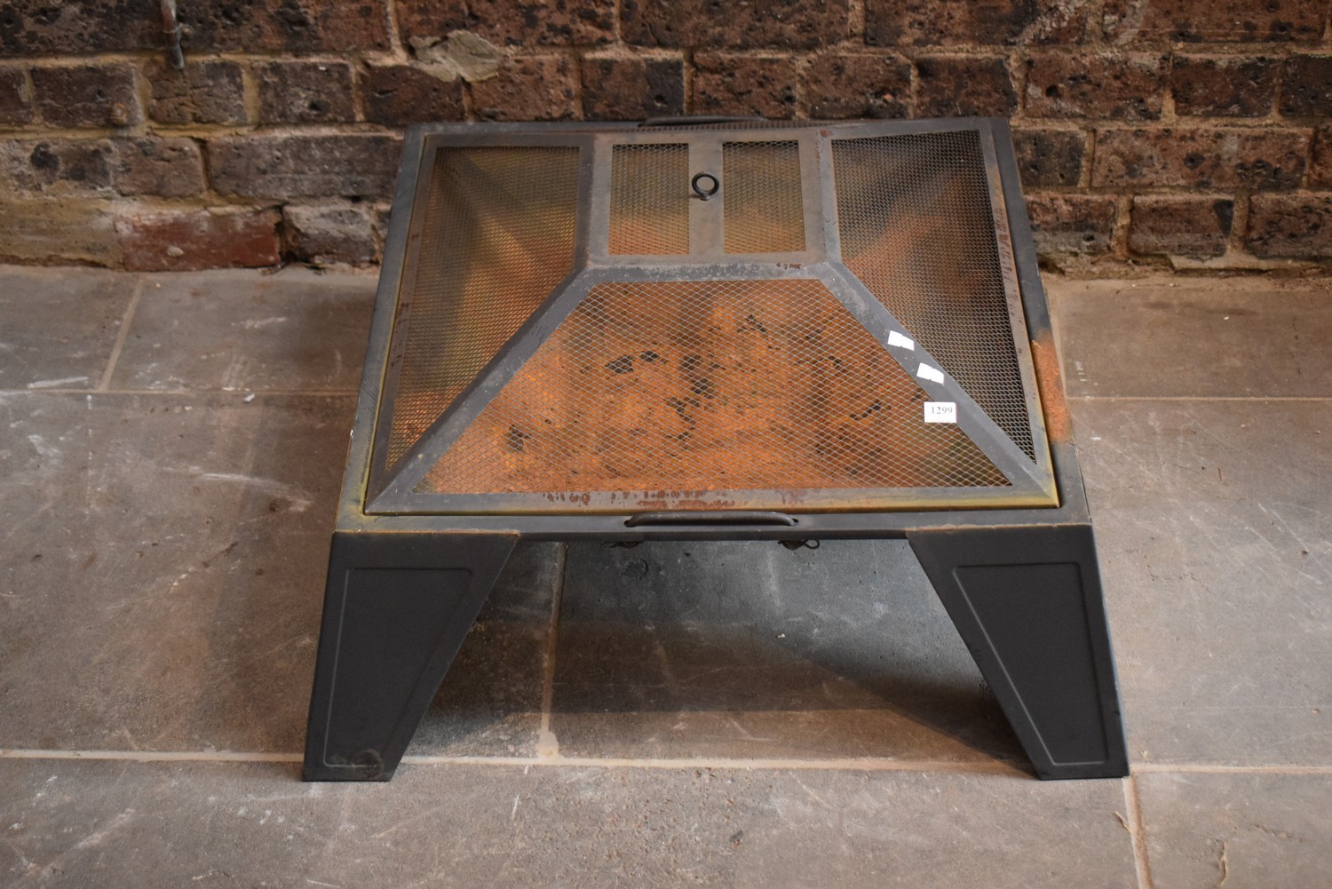 A METAL FIRE PIT WITH COVER (RUSTING TO INTERIOR)