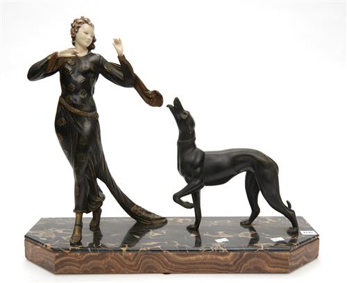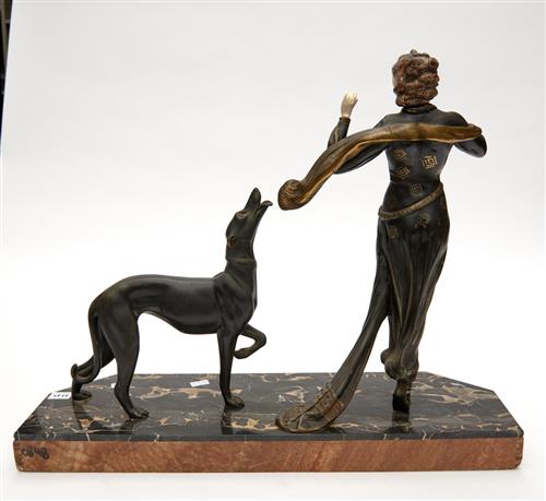 AN ART DECO PATINATED BRONZE FIGURE OF A WOMAN AND GREYHOUND, SIGNED H.45CM, W.53CM