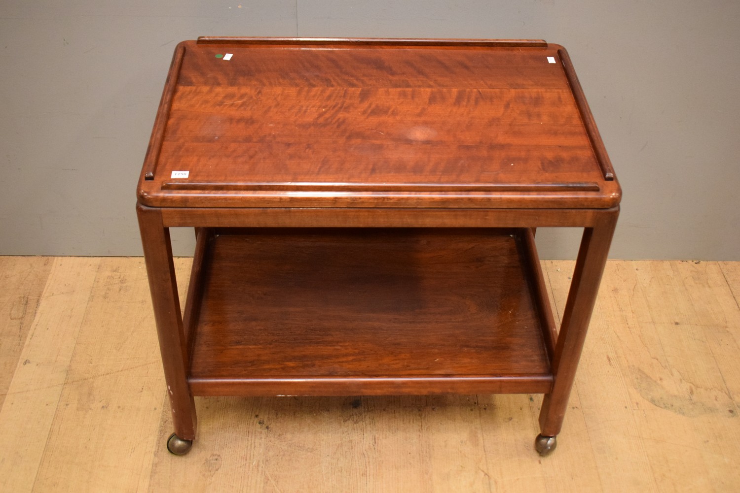 A 1950S TWO TIER MAHOGANY AUTO TROLLEY (65H X 75W X 50D CM)