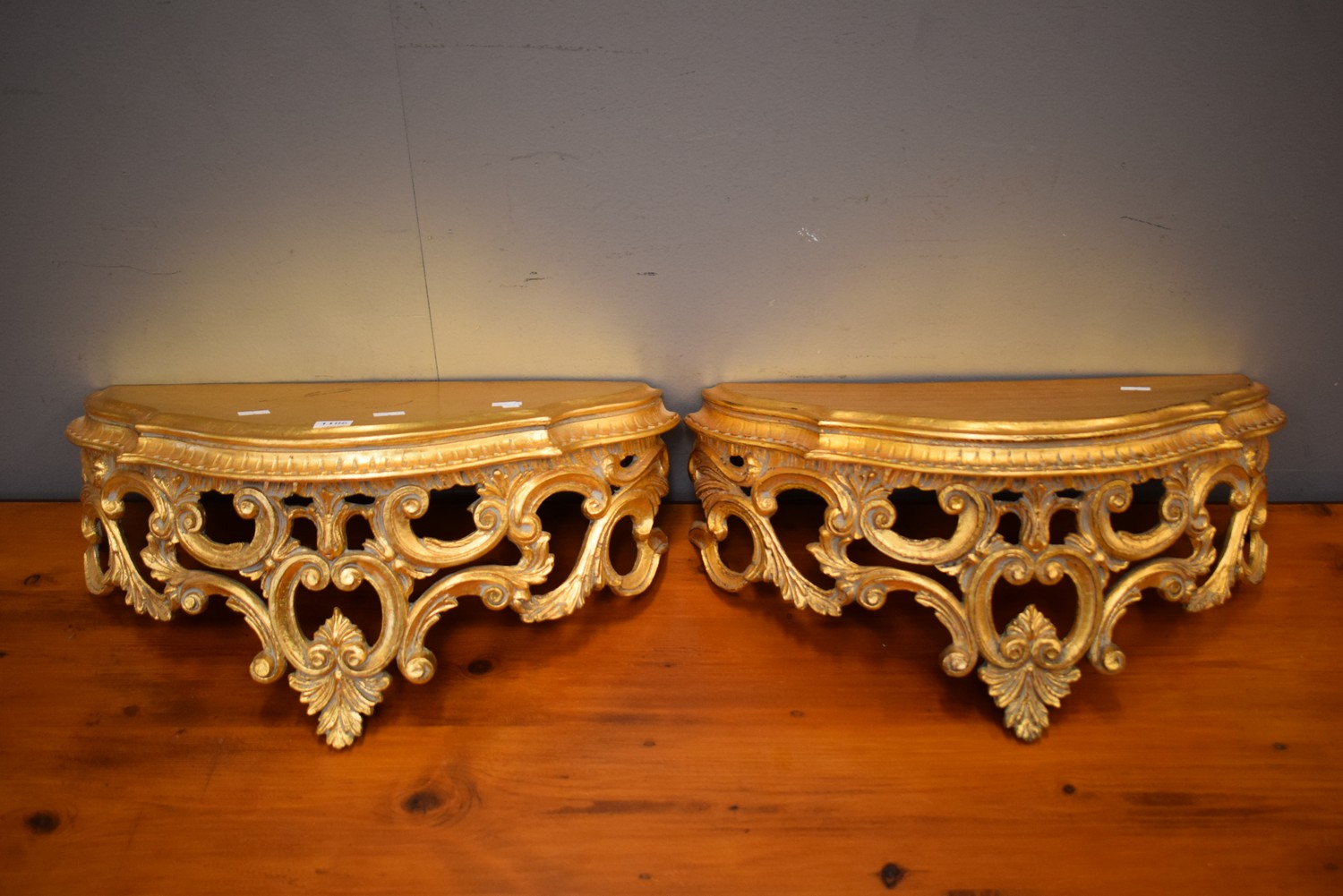 A PAIR OF 1960S GILDED FIBREGLASS AND WOODEN DEMILUNE WALL SHELVES
