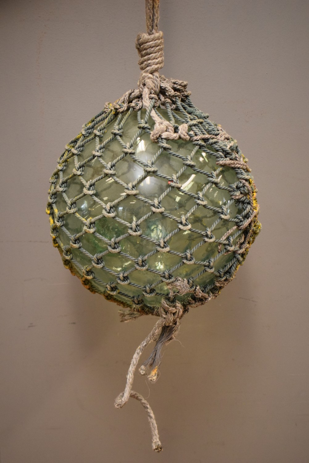 A LARGE 1940S GLASS AND ROPE SHIP BUOY/FISHING FLOAT