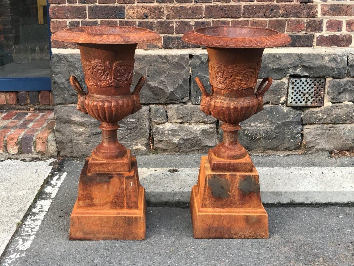 A PAIR OF CAST IRON URNS (93H x 48 Diameter Cm Each)