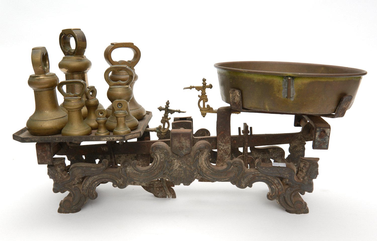 A 19TH CENTURY SET OF FIGURAL CAST IRON AND BRASS SCALES WITH COMPLETE SET OF 8 MATCHED BRASS BELL WEIGHTS W.57CM