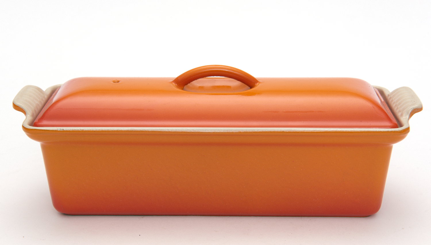 A MINT UNUSED RECTANGULAR ORANGE CAST IRON ENAMEL LE CREUSET CASSEROLE L.31CM