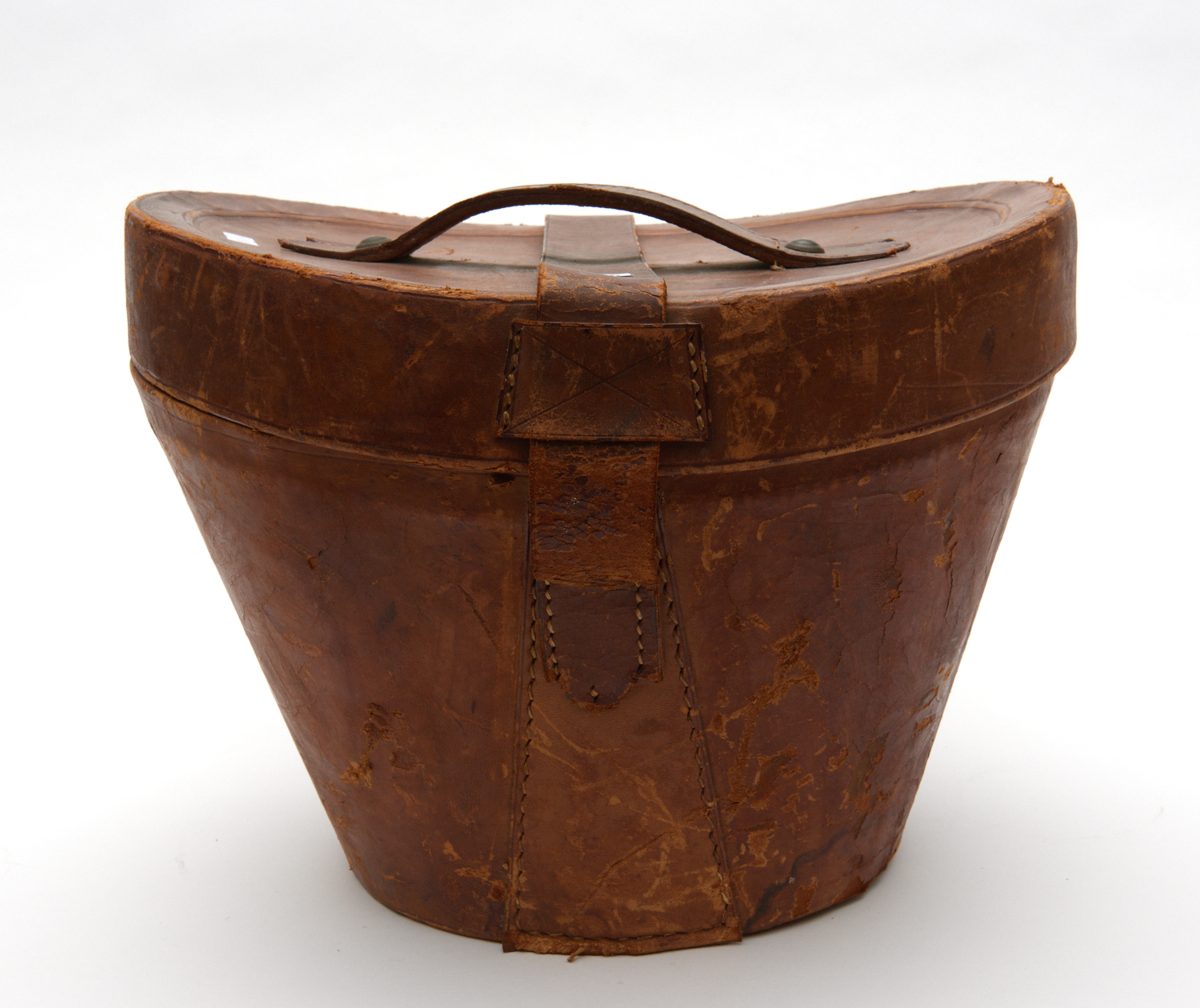 A 19TH CENTURY LEATHER HAT BOX WITH ORIGINAL BEAVER SKIN BOWLER HAT, THE BOX 28 CM HIGH, 36.5 CM WIDE