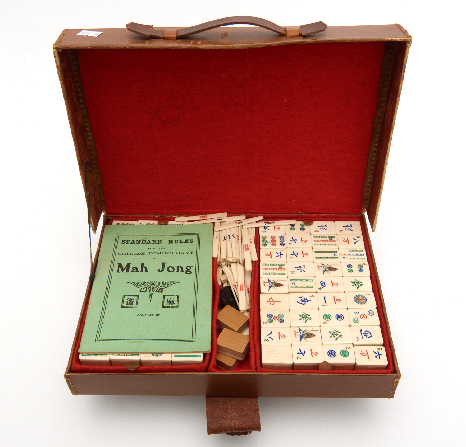 A 1900S CHINESE LEATHER CASED BONE AND BAMBOO MAHJONG SET WITH INSTRUCTIONS