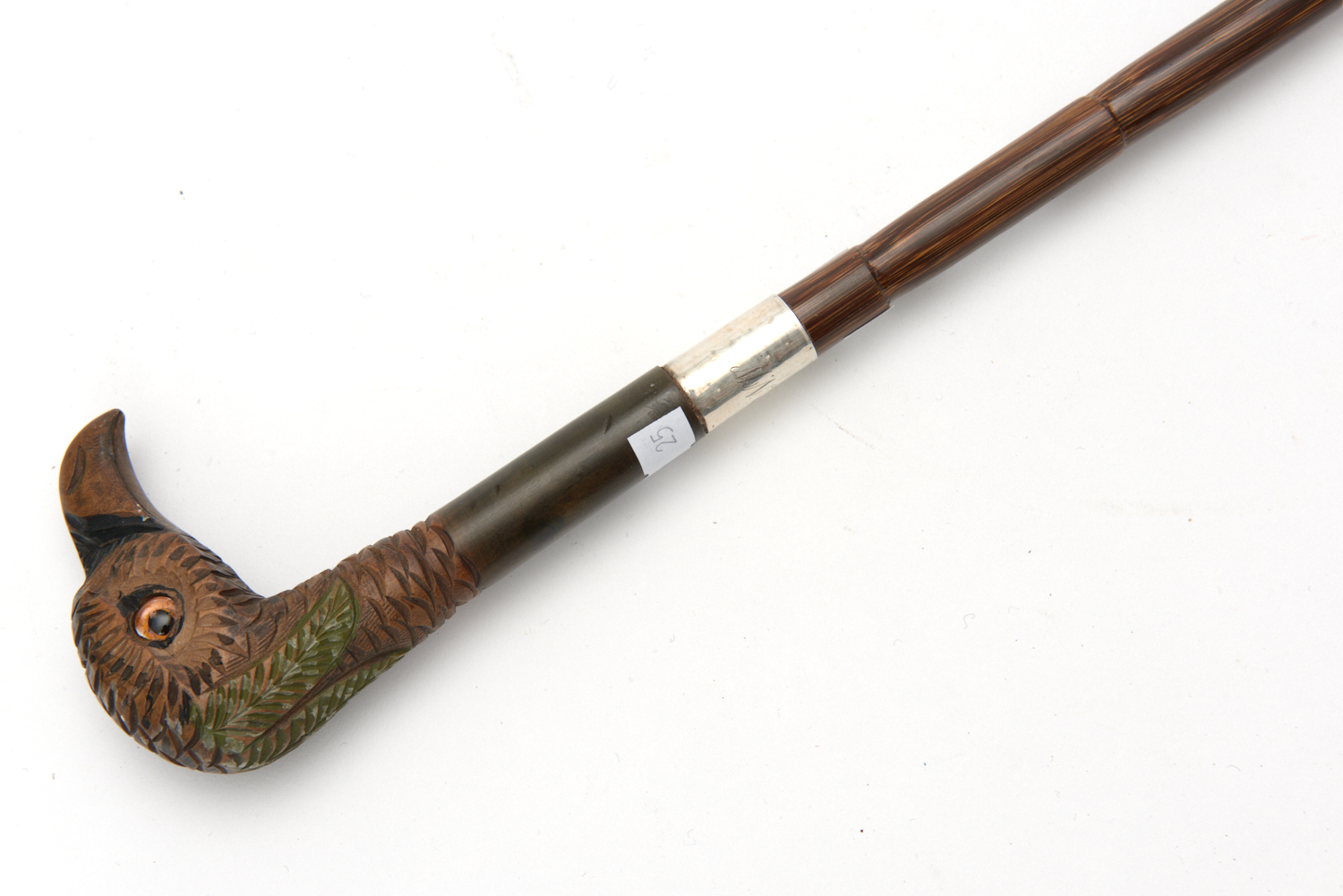 A 1900S CARVED AND PAINTED WOODEN BIRD HEAD WALKING STICK WITH STERLING SILVER COLLAR L.89CM