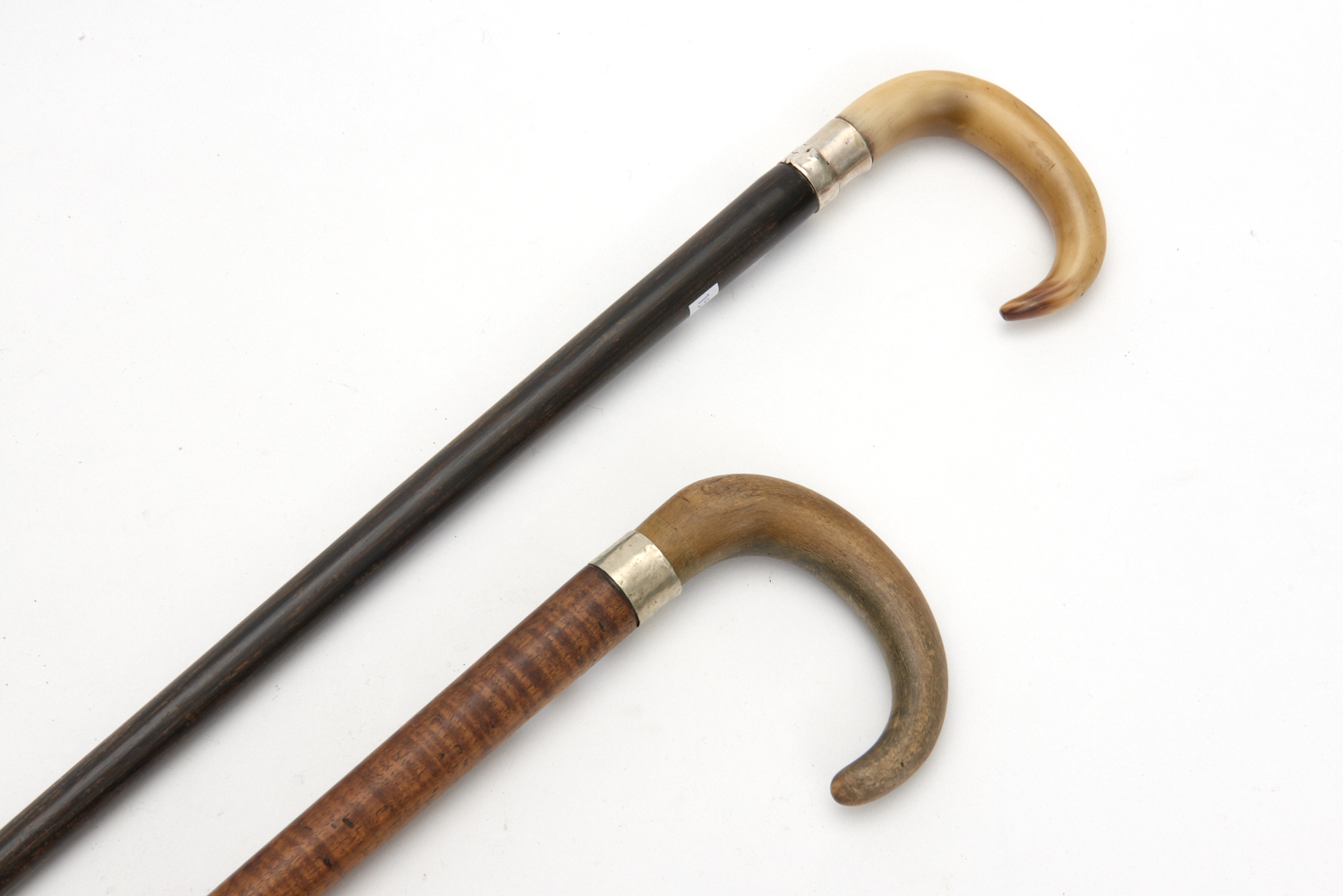 TWO HORN HANDLED AUSTRALIAN BLACKWOOD AND PALMWOOD WALKING STICKS WITH STERLING SILVER FERRULES TALLEST L.91CM