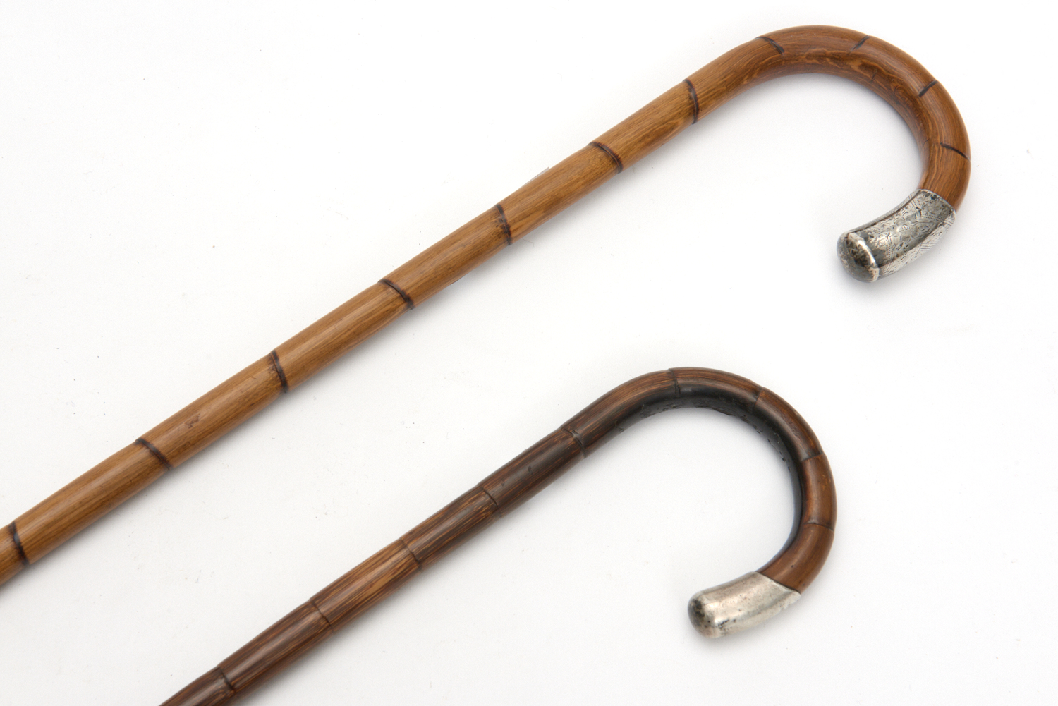 TWO CANE AND STERLING SILVER TIPPED WALKING STICKS TALLEST L.92CM