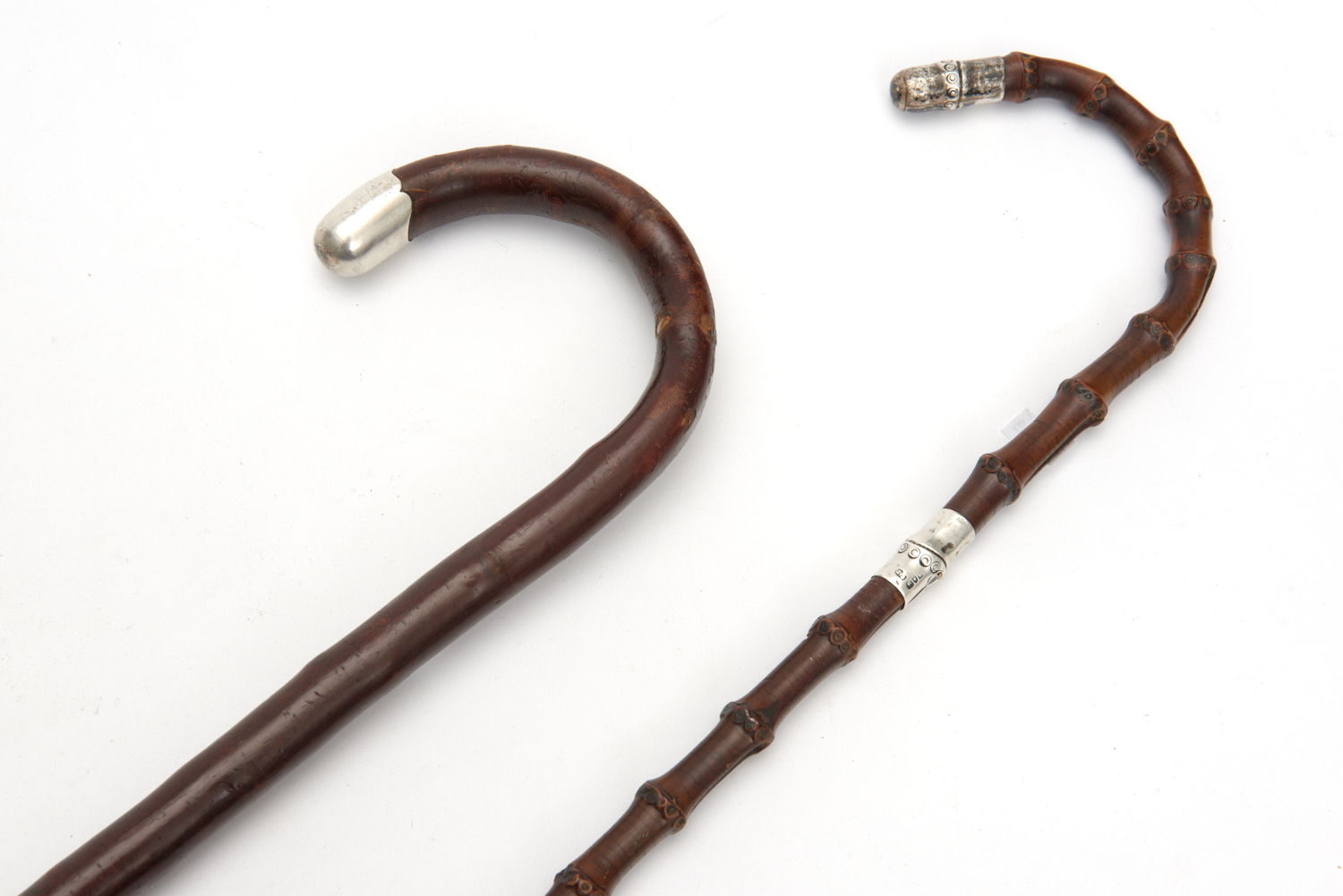 TWO WOODEN AND CANE WALKING STICKS WITH STERLING SILVER HANDLES AND FERRULE TALLEST L.90CM