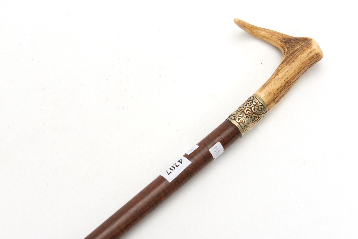 A 1900S AUSTRALIAN ANTLER HANDLED WALKING STICK WITH STERLING SILVER FERRULE L.86CM