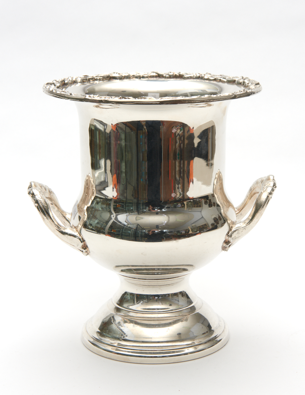 A 1950S AUSTRALIAN TWO HANDLED SILVER PLATED CHAMPAGNE BUCKET, 26.5 CM HIGH, 23 CM WIDE AT THE WIDEST POINT