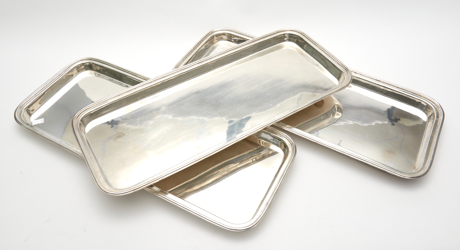 Oveall medium surface wear to each tray and isolated heavier marks, consistent with use over time; one tray is missing to circular pads from the underside; each tray stamped 'RALPH LAUREN' and remnant label