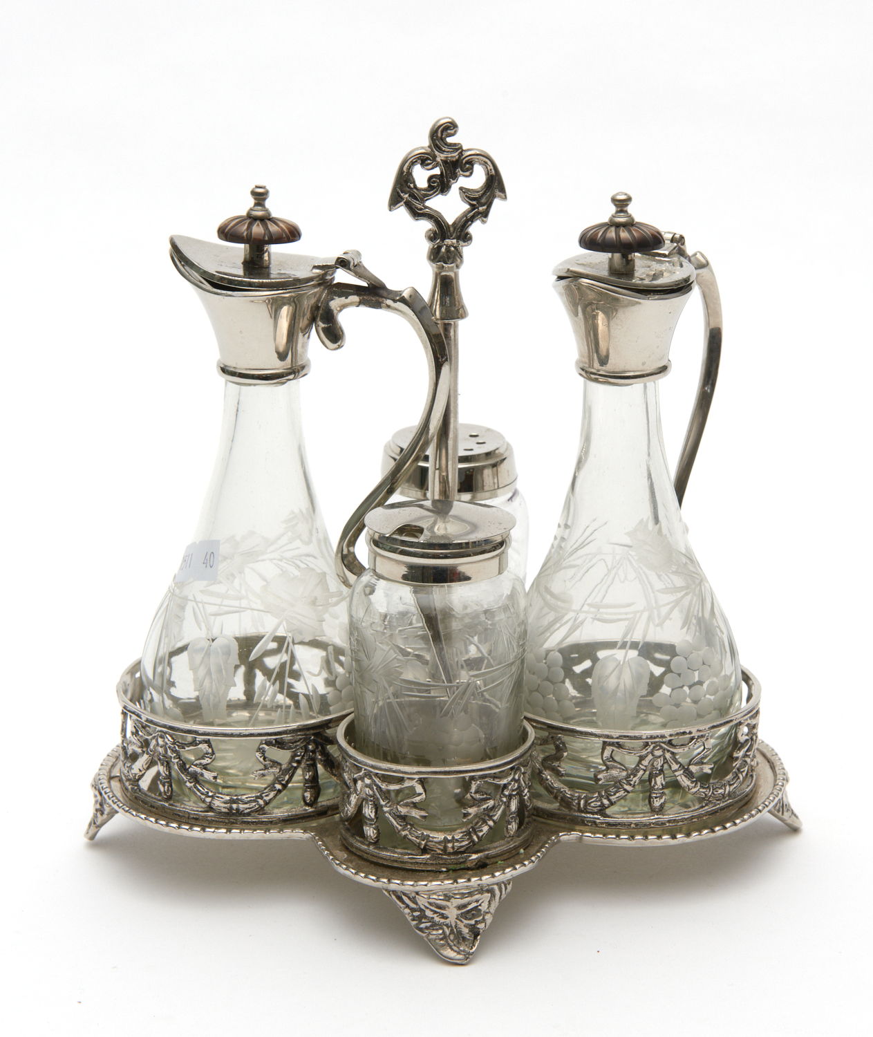 The bottles are in good order overall; some areas of tarnishing, loss and pitting to the silverplate