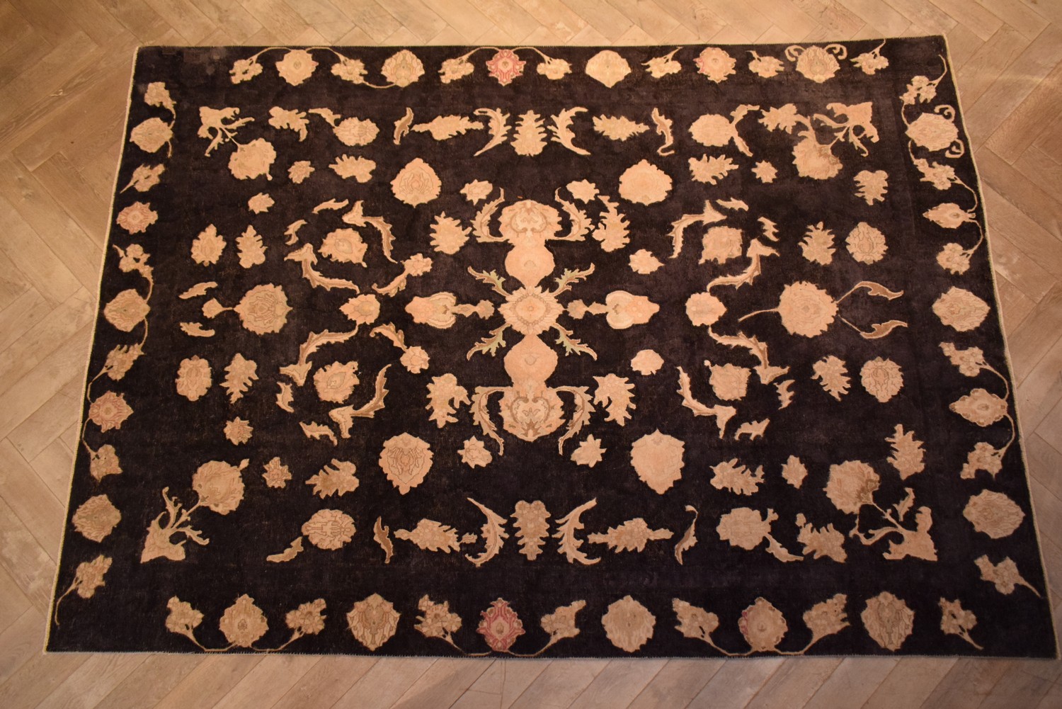 A MODERN OVER-DYED & HAND-CARVED VINTAGE PERSIAN TABRIZ CARPET. EX-GALLERY STOCK. ONE OF A KIND. AN ORIGINAL HAND-KNOTTED PERSIAN TABRIZ CARPET, KNOTTED USING HAND SPUN WOOL ON STRONG COTTON WARPS WITH THE PILE SHORN DOWN. THE RUG IS OVER-DYED IN COLOUR-FAST DYES AND HAND-CARVED TO CREATE UNIQUE PATTERNS. AS SEEN IN VOGUE & HOME DÉCOR MAGAZINES. CERTIFICATE OF AUTHENTICITY INCLUDED. SIZE: 370X263CM, ORIGIN: PERSIA – RRP: $5,500