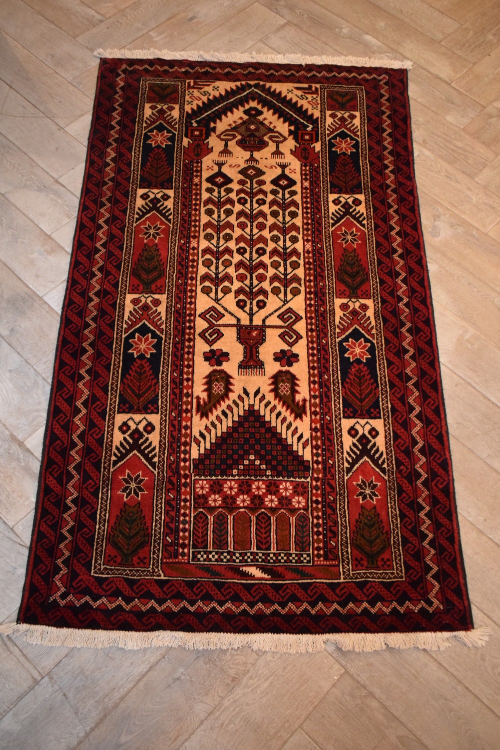 A TRIBAL PERSIAN TORBAT TURKOMAN PRAYER RUG. 100% WOOL. IN EXCELLENT CONDITION. EX-GALLERY STOCK. HAND-KNOTTED TRIBAL WEAVE WITH PICTORIAL DESIGN OF CENTRAL PANEL CONTAINING A PRAYER NICHE AND URN BEARING FLORAL FOLIAGE SET AGAINST PANELS CONTAINING CYPRESS TREES. OUTER BORDER OF SCROLL PATTERNS. CERTIFICATE OF AUTHENTICITY INCLUDED. SIZE: 185X99CM, ORIGIN: PERSIA – RRP: $1,200