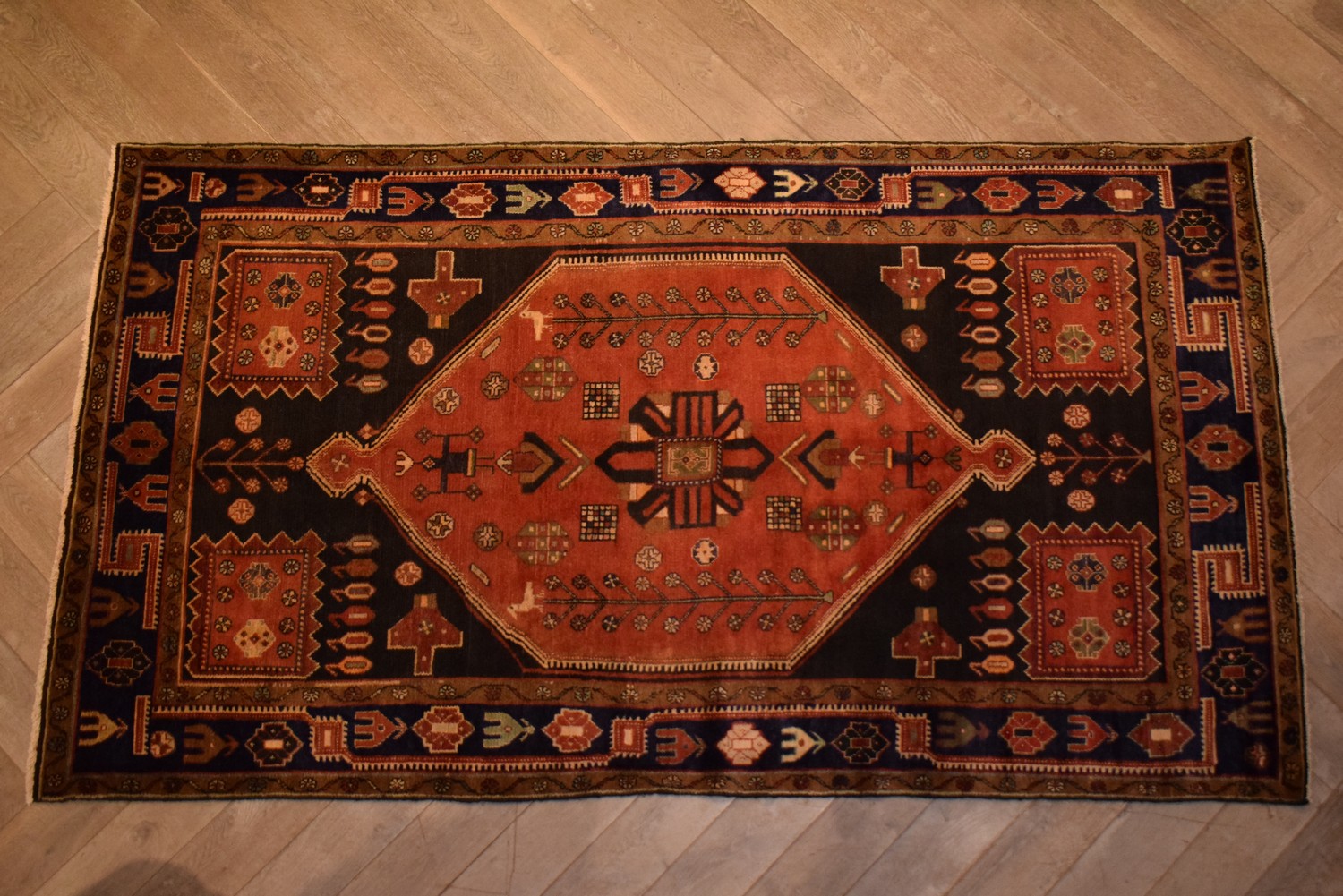 A RARE NOMADIC PERSIAN SHAHSAVAN RUG. 100% WOOL. DENSE PILE. IN PRISTINE CONDITION. EX-GALLERY EXHIBITED. FIRST TIME OFFERED. HAND-KNOTTED NOMADIC WEAVE WITH RARE DESIGN OF STYLIZED MEDALLION AND SECONDARY GEOMETRIC PATTERNS & 'TREE OF LIFE' FORMS SET WITHIN A HEXAGONAL FIELD. SQUARE-SHAPED CORNER MEDALLIONS CONTAINING FLORAL PATTERNS. CERTIFICATE OF AUTHENTICITY INCLUDED. SIZE: 275X153CM, ORIGIN: PERSIA – RRP: $3,900