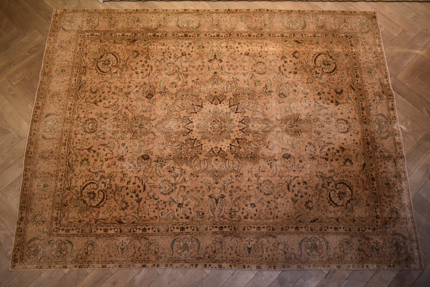 A MODERN OVER-DYED & HAND-CARVED VINTAGE PERSIAN TABRIZ CARPET. EX-GALLERY DISPLAYED STOCK. FIRST TIME OFFERED. AN ORIGINAL HAND-KNOTTED PERSIAN TABRIZ CARPET, KNOTTED USING HAND SPUN WOOL ON STRONG COTTON WARPS WITH THE PILE SHORN DOWN. THE RUG IS OVER-DYED IN COLOUR-FAST DYES AND HAND-CARVED TO CREATE UNIQUE PATTERNS. AS SEEN IN VOGUE & HOME DÉCOR MAGAZINES. CERTIFICATE OF AUTHENTICITY INCLUDED. SIZE: 382X263CM, ORIGIN: PERSIA – RRP: $6,900