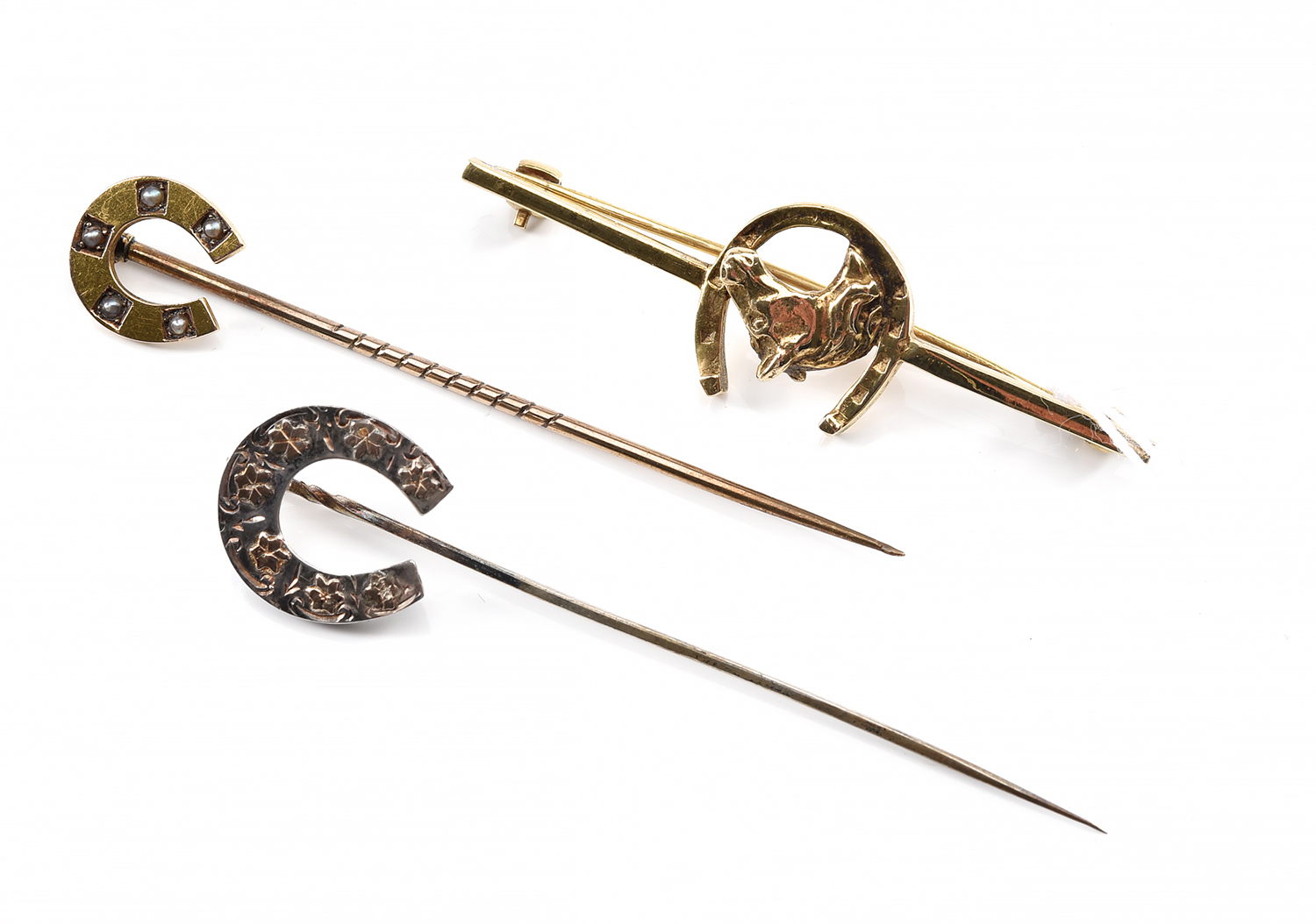A COLLECTION OF ANTIQUE BROOCHES INCLUDING A GOLD HORSE AND CROP BROOCH IN 9CT GOLD, A HORSESHOE STICK PIN IN GOLD AND SILVER AND A SEED PEARL STICK PIN IN 9CT GOLD, TOTAL WEIGHT OF 9CT GOLD 5.83GMS, RETAILED BY KOZMINSKY