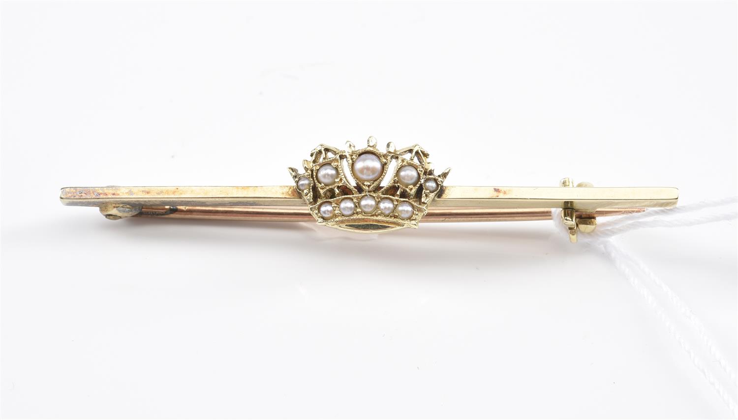 A SEED PEARL SET CROWN BAR BROOCH, IN 14CT GOLD, TOTAL WEIGHT 2.6 GRAMS, RETAILED BY KOZMINSKY