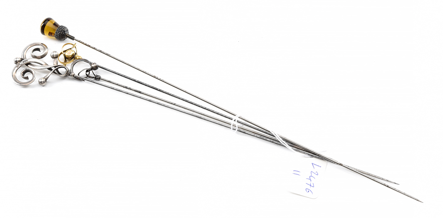 THREE CHARLES HORNER ART NOUVEAU HAT PINS, ONE CRAFTED IN ROLLED GOLD, AND TWO IN STERLING SILVER, SIGNED AND HALLMARKED, TOGETHER WITH AN ACORN HAT PIN, RETAILED BY KOZMINSKY