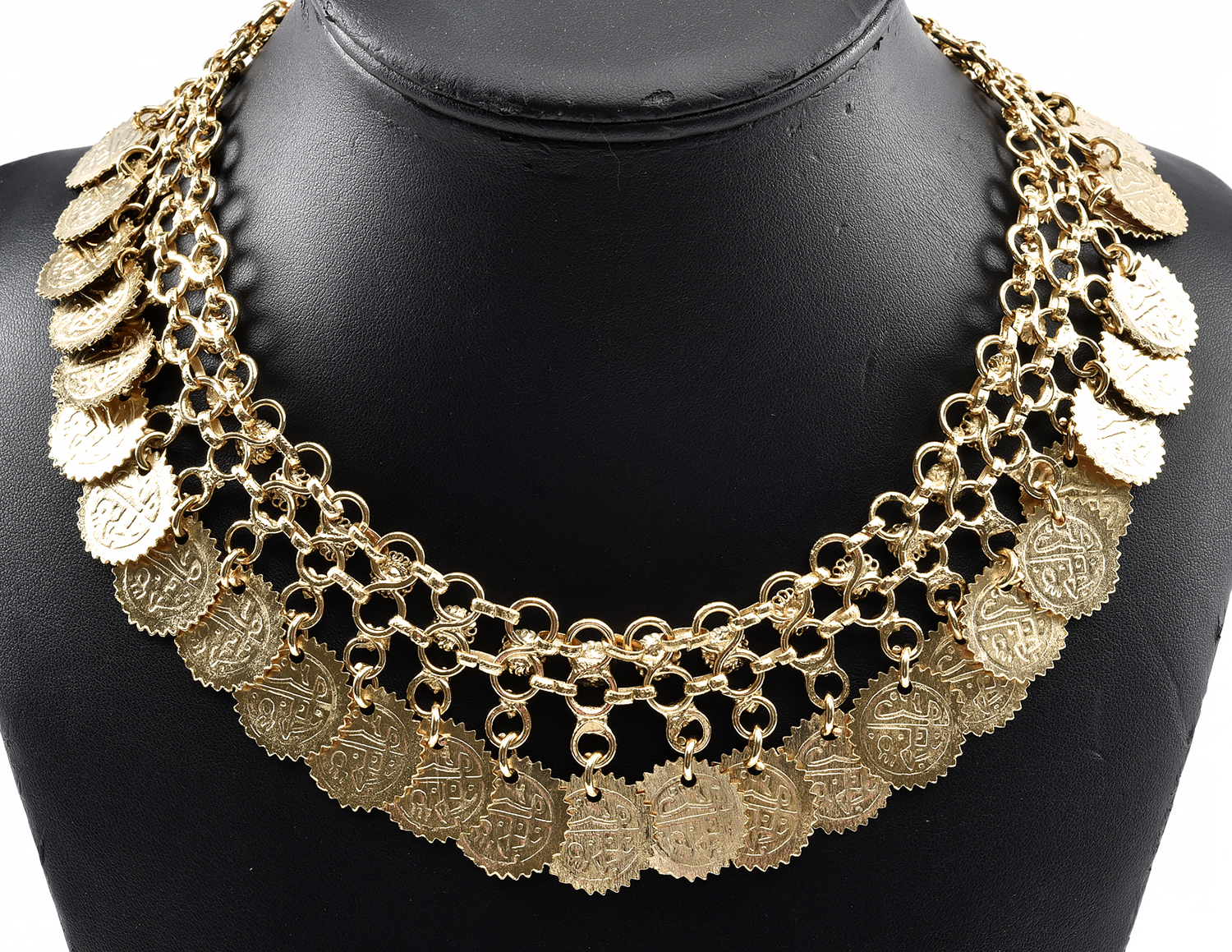 A VINTAGE COSTUME GYPSY COIN NECKLACE IN GOLD TONE, RETAILED BY KOZMINSKY, TOTAL LENGTH 450MM