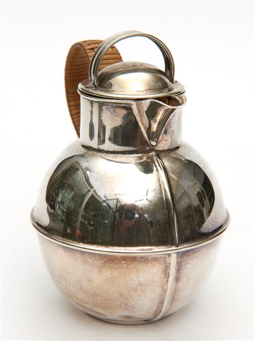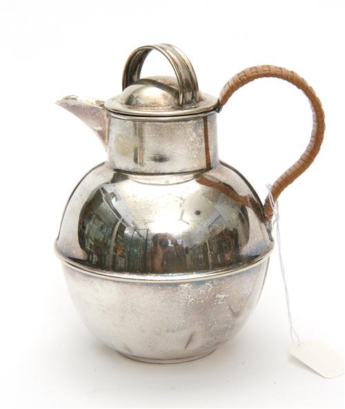 A SILVER PLATED CREAM JUG WITH WICKER HANDLE H.15CM