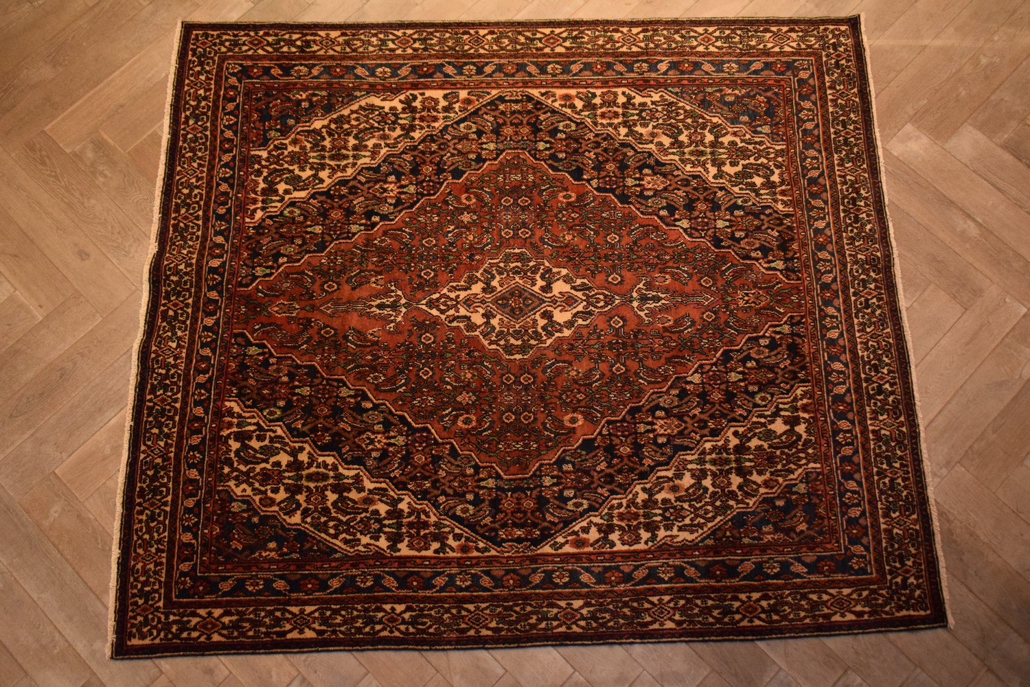 A PERSIAN HOSSAINABAD RUG, 100% WOOL. NATURAL DYES. DENSE PILE. EX-GALLERY STOCK. IN EXCELLENT CONDITION. RARE SIZE. HAND-KNOTTED VILLAGE WEAVE WITH TRIBAL DESIGN OF ELONGATED MEDALLION IN A PRIMARY RED, SECONDARY NAVY AND TERTIARY CREAM FIELD OF ALL-OVER HERATI MAHI PATTERNS. BORDER OF HERATI PATTERNS. CERTIFICATE OF AUTHENTICITY INCLUDED. SIZE: 261X232CM, ORIGIN: PERSIA – RRP: $2,990