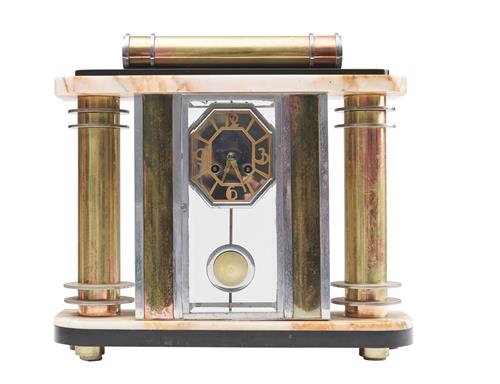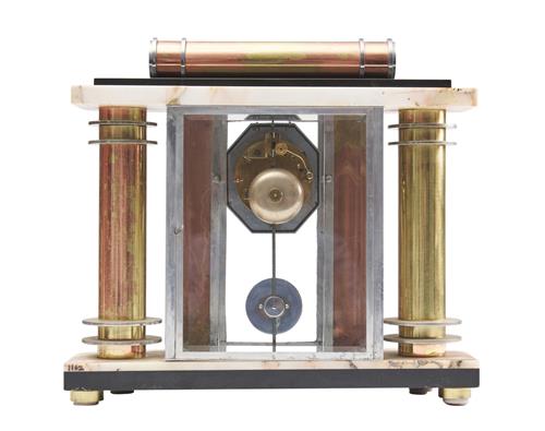The chromed brass and glass cased clock, typical in design for the Art Deco period. The top and sides adorned with cylindrical columns.