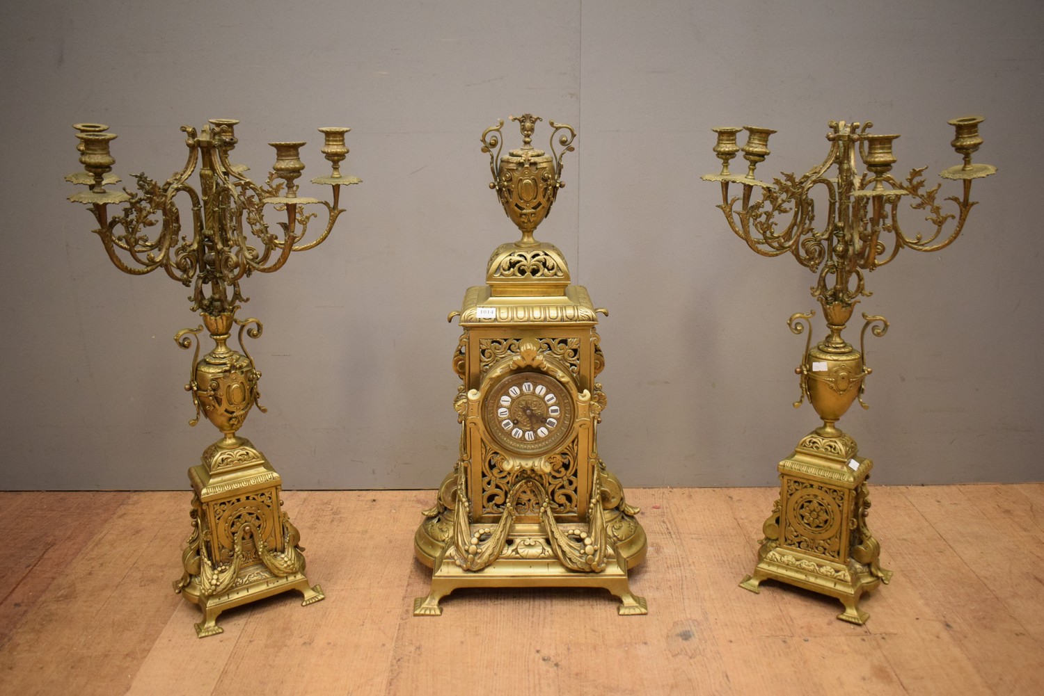 A HIGHLY DECORATIVE THREE PIECE CLOCK GARNITURE (a/f) (68 CM H)