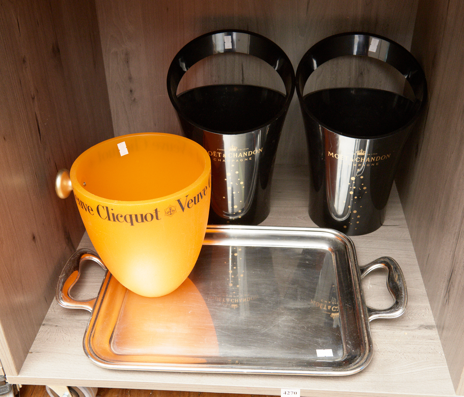 AN ALESSI TRAY AND A PAIR OF MOET & CHANDON AND VEUVE CLICQUOT ICE BUCKETS