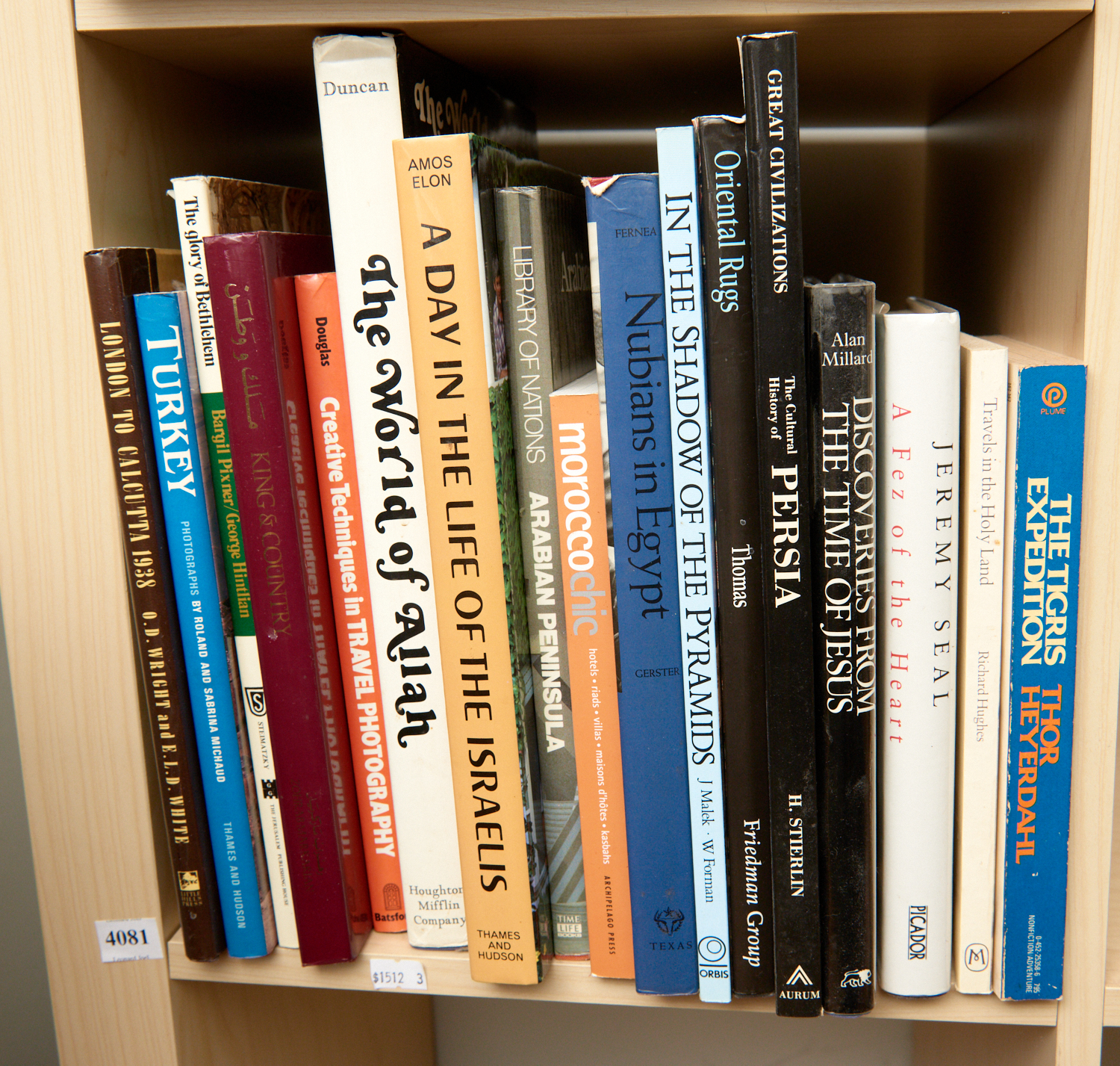 A SHELF OF BOOKS RELATING TO TRAVEL AND THE MIDDLE EAST
