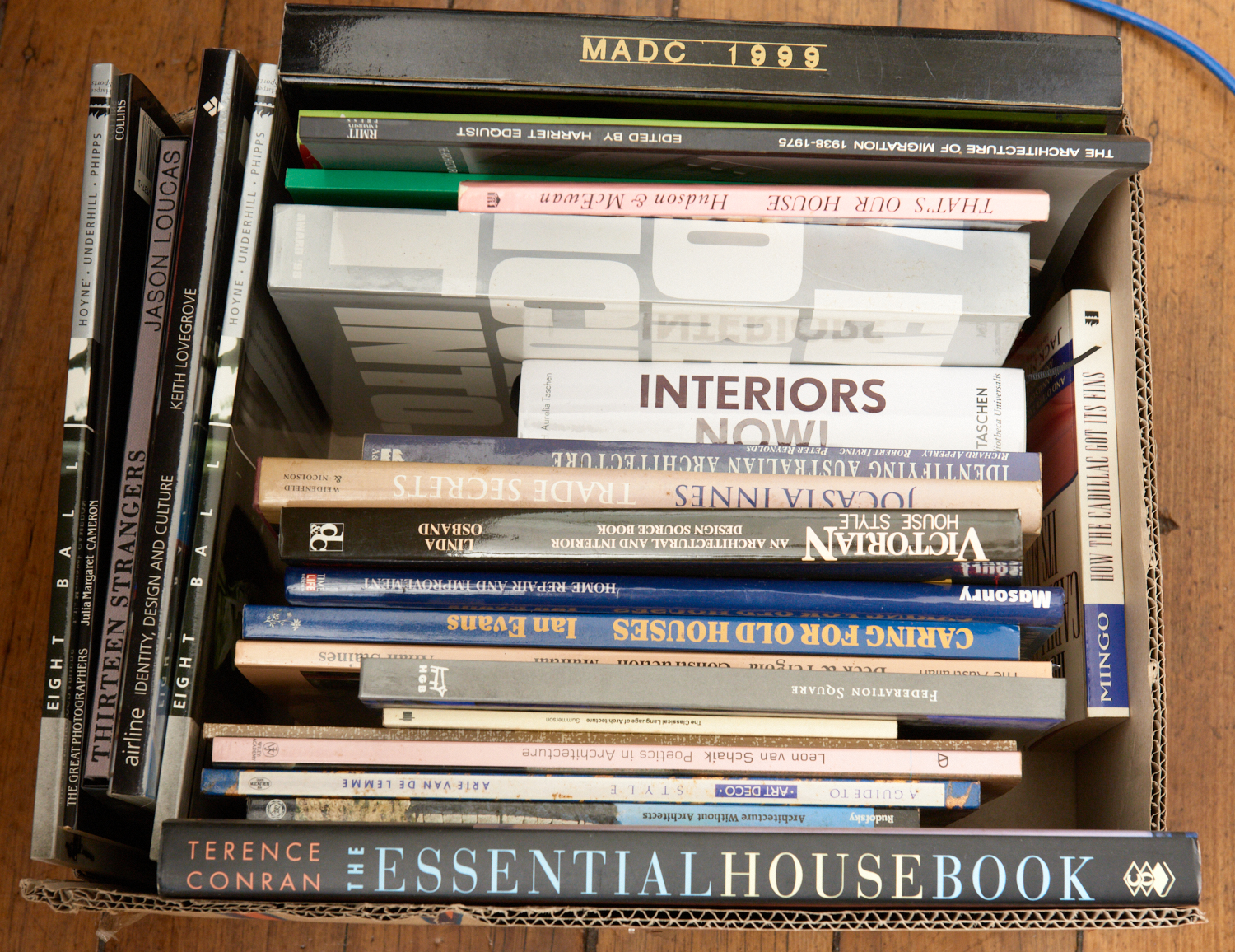 A SHELF OF BOOKS RELATING TO INTERIORS AND DESIGN