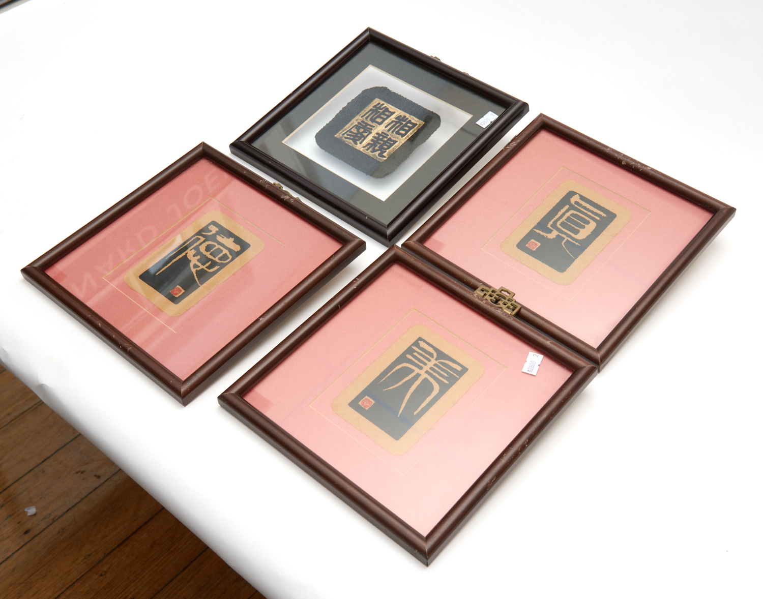 FOUR CHINESE CHARACTER PRINTS. THE LARGEST FRAME 22.5CM X 22CM