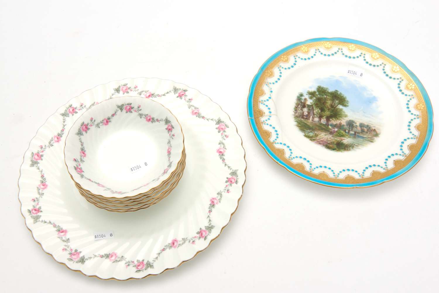 A COLLECTION OF MINTON PORCELAIN, INCLUDING A VICTORIAN CABINET PLATE (STAPLE REPAIR), SIX FLORAL PAINTED BOWLS AND A MATCHING PLATE