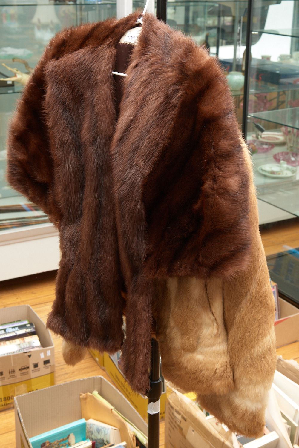 Stole: retail label 'Created by / Ajax Furs / of Melbourne / 143 RUSSELL STREET', colour strong throughout; small patch of wear near left armpit area and areas of thinning to the fur near the central join at the back; lining in good order