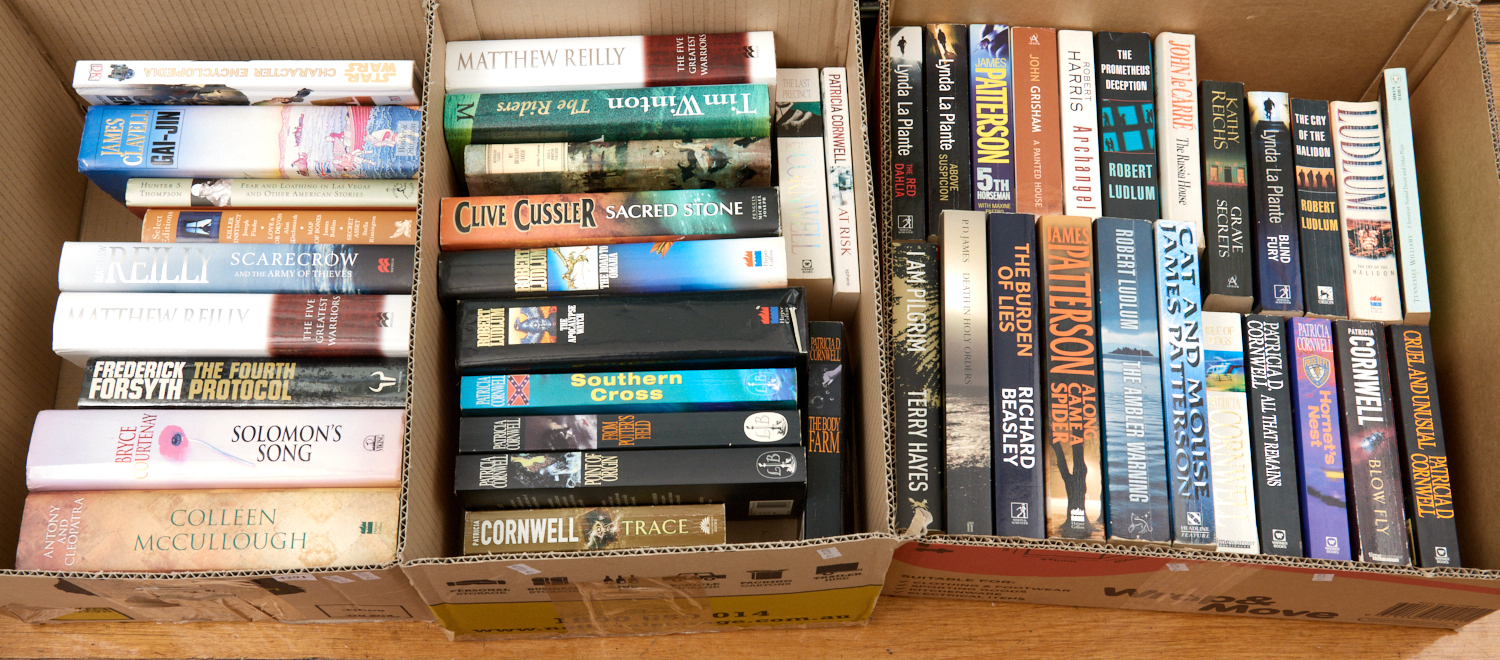 A LARGE COLLECTION OF PAPERBACK CRIME AND MYSTERY NOVELS, INCLUDING AUTHORS CLIVE CUSSLER, TIM WINTON, LYNDA LA PLANTE, BRYCE COURTNEY