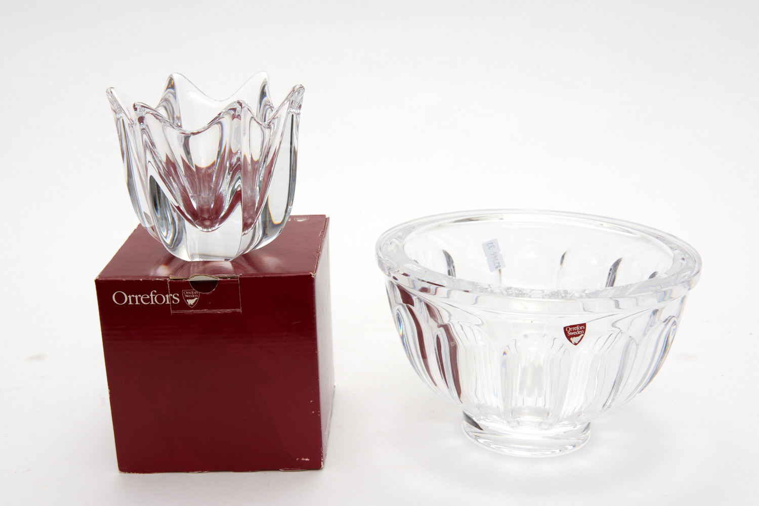TWO ORREFORS BOWLS ONE WITH BOX LARGEST DIA 20CM