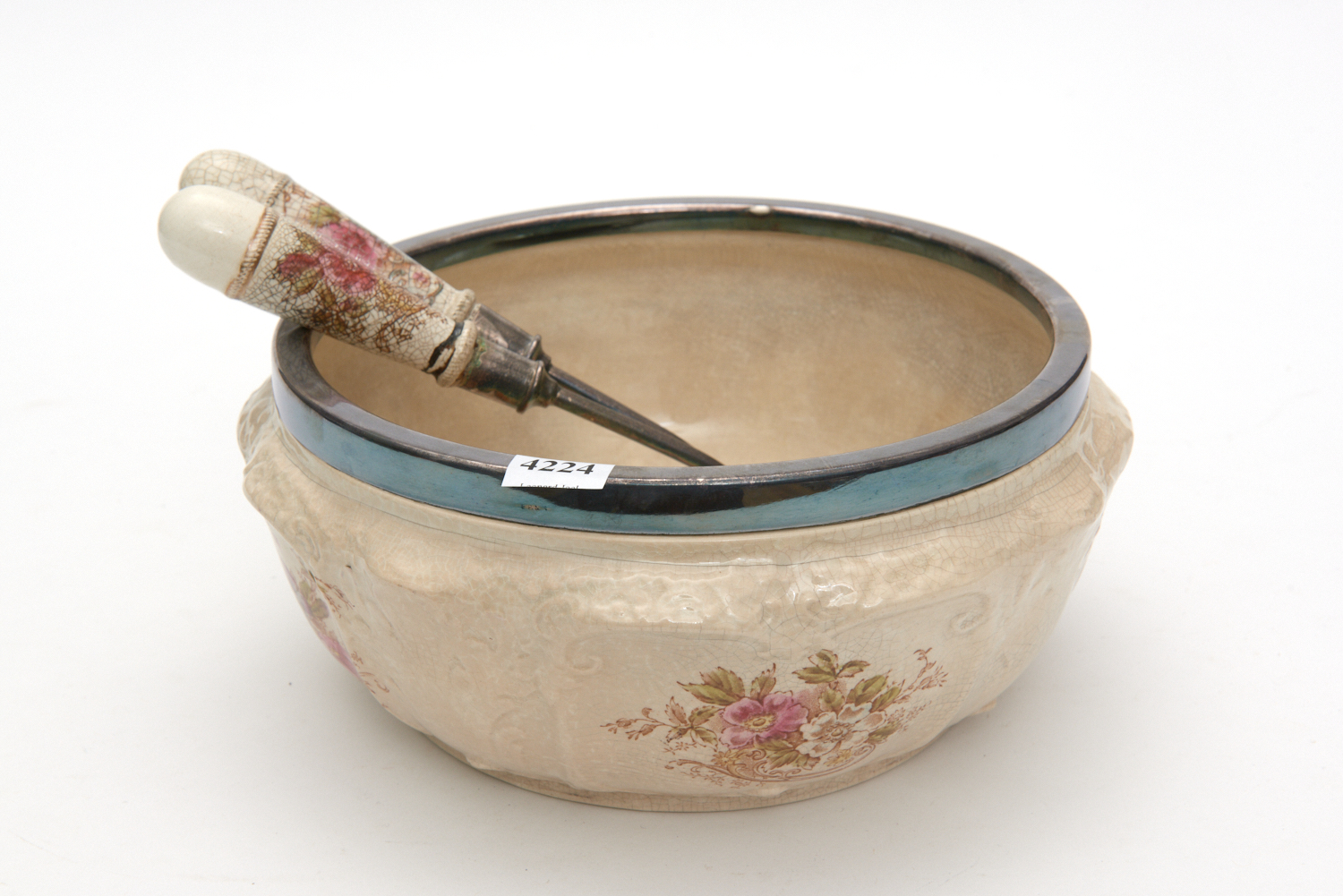 AN S.F & CO PORCELAIN SERVING BOWL WITH SILVER PLATED RIM TOGETHER WITH UTENSILS