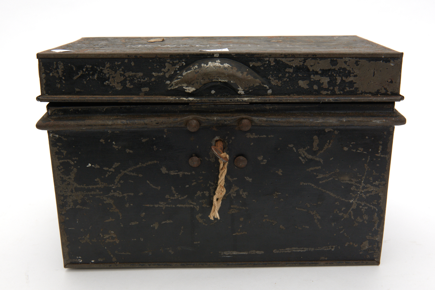 AN ANTIQUE SAFETY DEPOSIT BOX WITH KEY 20 X 30 X 17CM