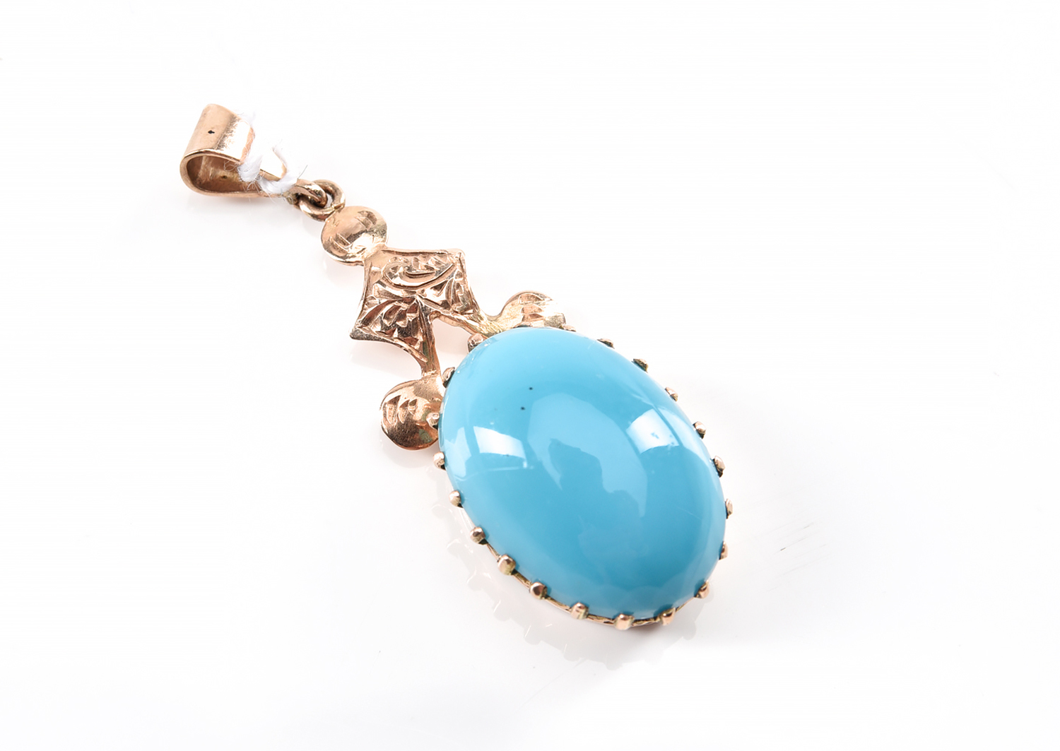 A TURQUOISE SIMULANT PENDANT IN 9CT GOLD, LENGTH 30MM APPROXIMATELY