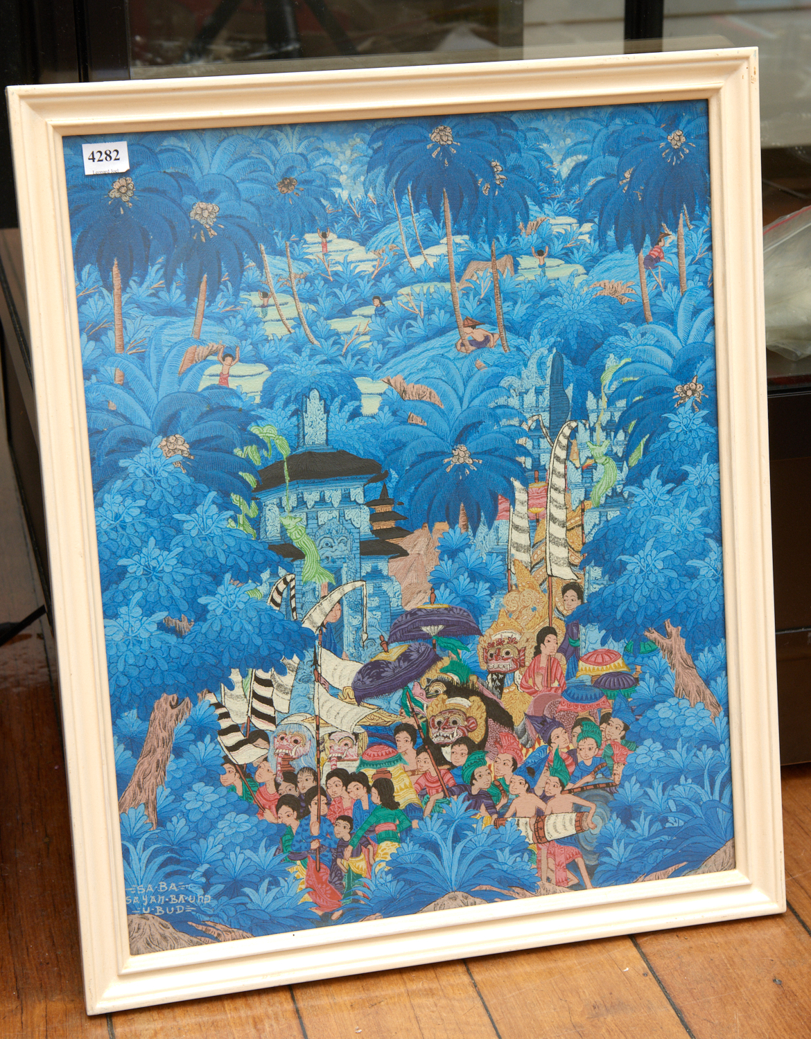 A BALINESE PAINTING, SIGNED SA-BA, SAYAN-BAUNG, UBUD. 54CM X 44.5CM (INCLUDING FRAME)
