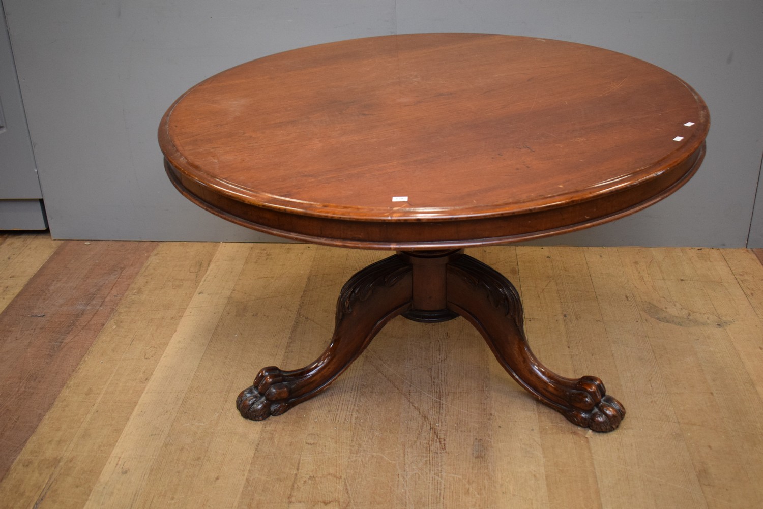 A VICTORIAN CIRCULAR BREAKFAST TABLE ON A TRIPOD CLAW FOOT BASE (69H x 120D CM)