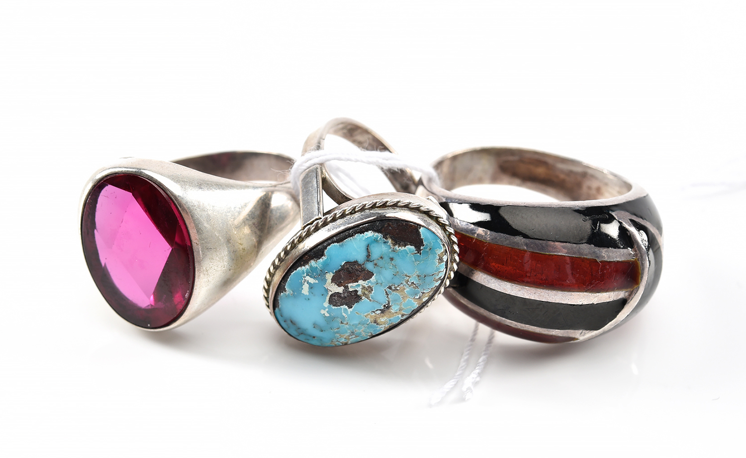 A COLLECTION OF DRESS RINGS IN STERLING SILVER INCLUDING ENAMEL, TURQUOISE AND RED STONE, SIZES N-S-T