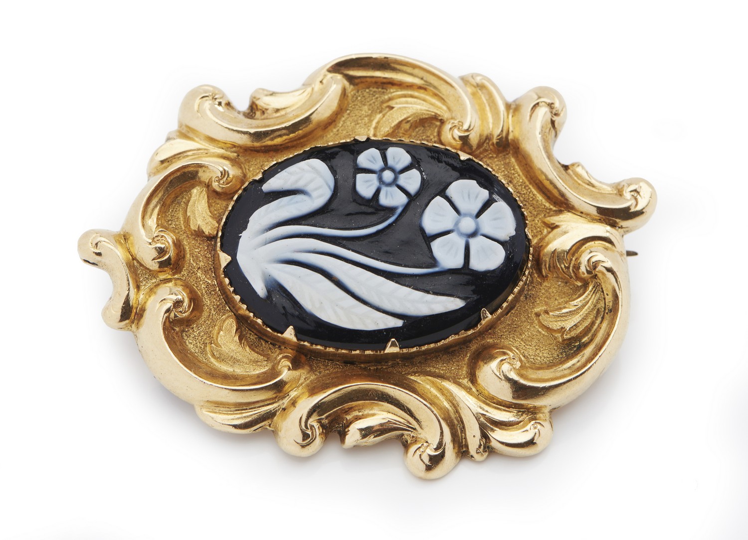 The brooch presents in excellent order with the onyx in very good order. The glazed panel at the reverse has a hair feature, the plaited design has loosened). The pin fitting is slightly loose. 9.39 grams.