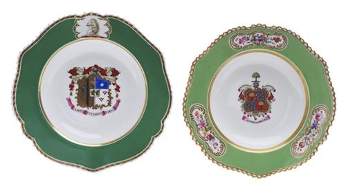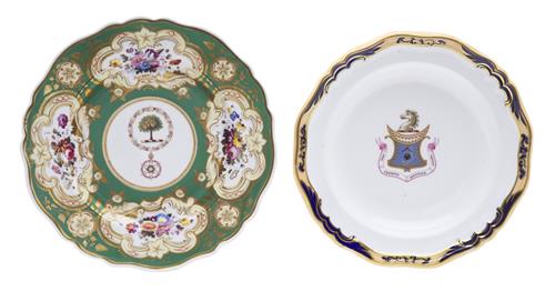 A Chamberlains Worcester shaped dish with a gilt gadrooned rim containing a crest within a gilt cartouche, the centre decorated with the arms of the Naylor family above the motto, "Cassis Titissima Virtus". Marked Chamberlain's Worcester in script. c.1825. A Chamberlains Worcester "Royal Gadroon" shaped dish, the green ground reserving three cartouches painted with colourful flowers, the centre finely painted with the arms and crest of the Oliviera family above the motto "Audentior Ibo". Unmarked. c.1825. A Chamberlain's Worcester shaped dessert plate, the green ground reserving four cartouches with sprays of flowers, and with scattered white flower heads in between. The centre finely decorated with the Crest, Collar and Badge of the Brazilian Order of the Rose, including the minutely painted motto "Amor E Fidelidad". Marked with Chamberlain's Worcester. c.1825. An English dish with a moulded and gilt border, the centre with the finely painted crest, arms and motto of Uderhaj, Maharaja of Burdwan in Bengal. Impressed letters to base. c.1855.