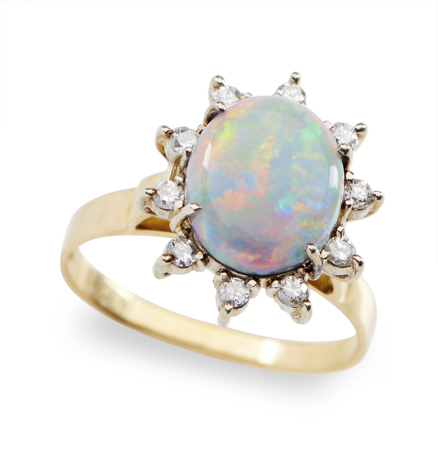 The ring presents in very good condition overall. The opal is in very good order with no chips, cracks or crazing. Diamonds are of a good commercial quality. Minor wear to gold surfaces. 4.24grams.